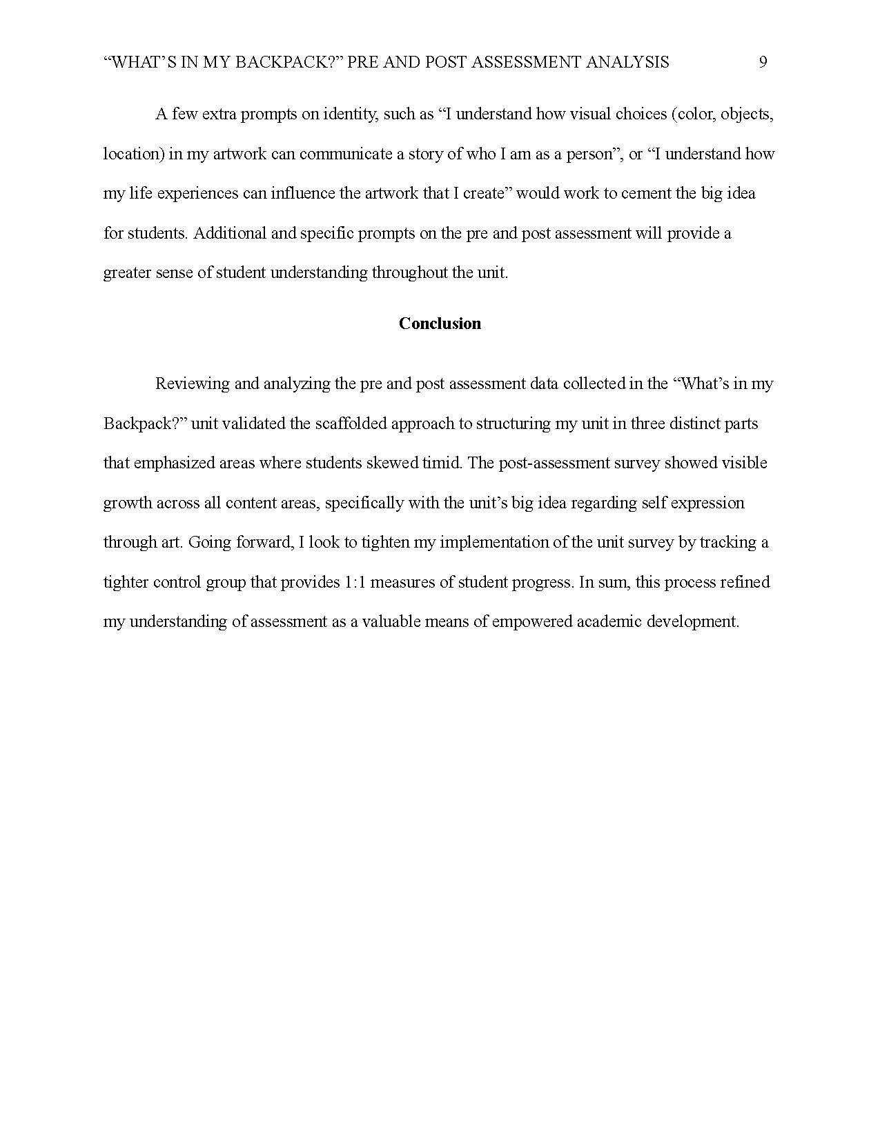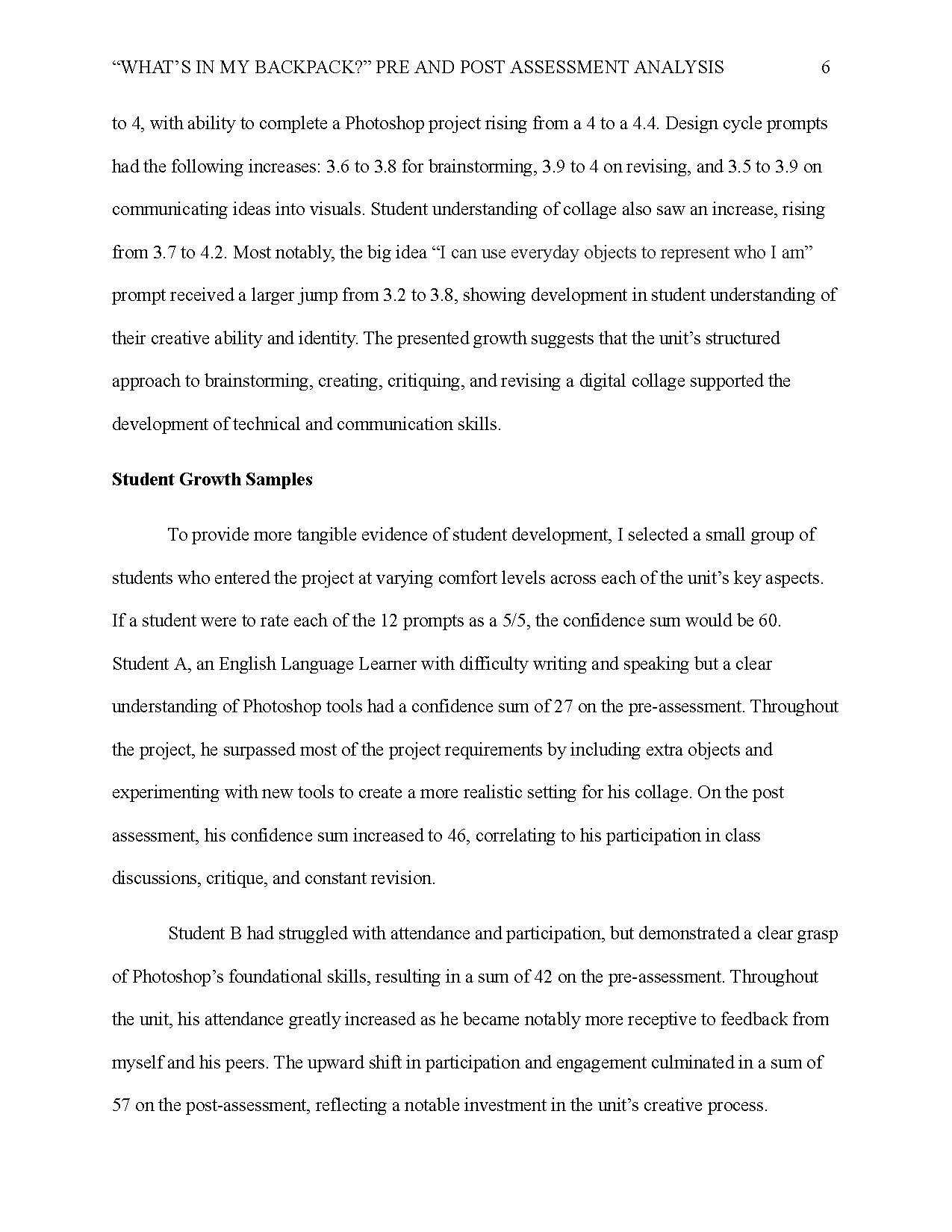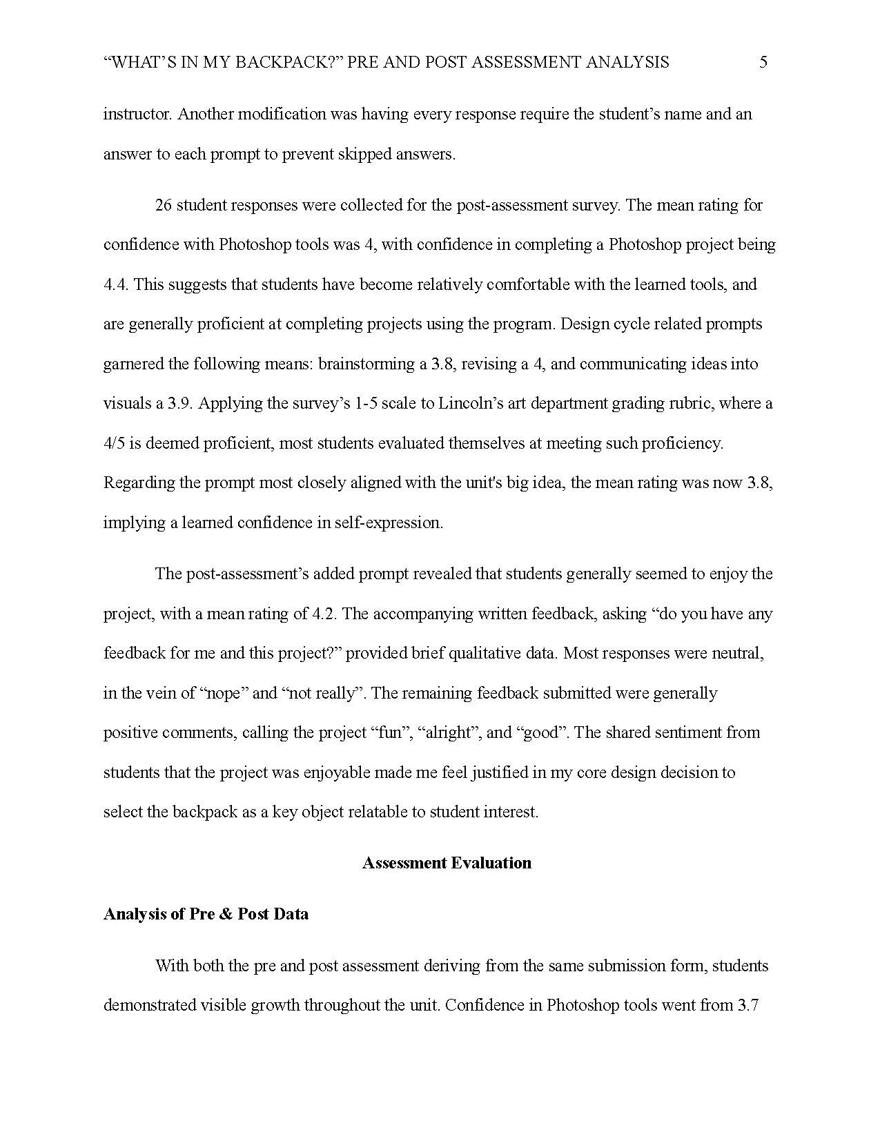 An analysis of pre and post assessment data collected from students in the "What's in my Backpack?" unit.